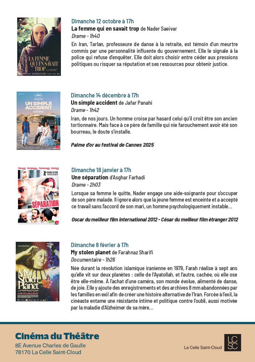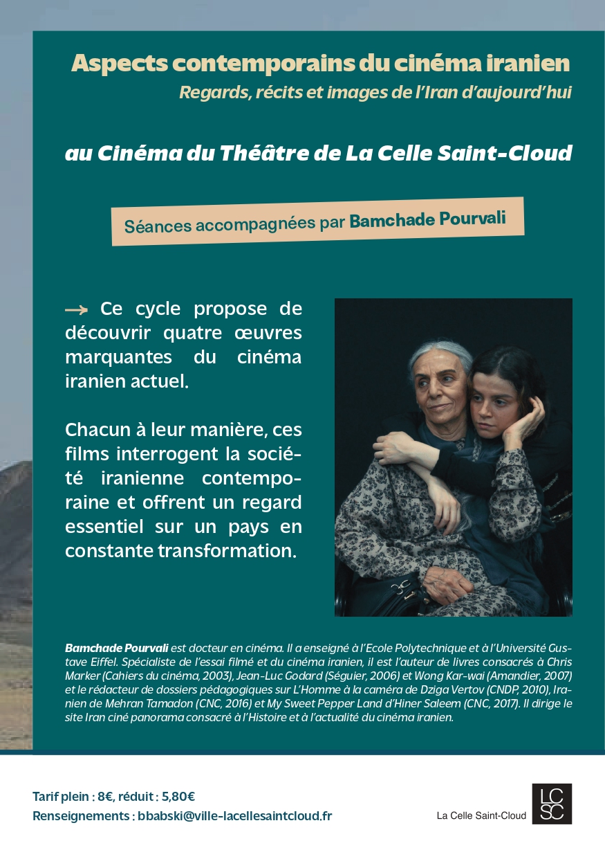 Du 12 octobre 2025 au 8 février 2026 à 17h, le Cinéma du Théâtre de La Celle Saint-Cloud propose un programme de quatre projections : « Aspects contemporains du cinéma iranien », présentées par Bamchade Pourvali.