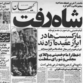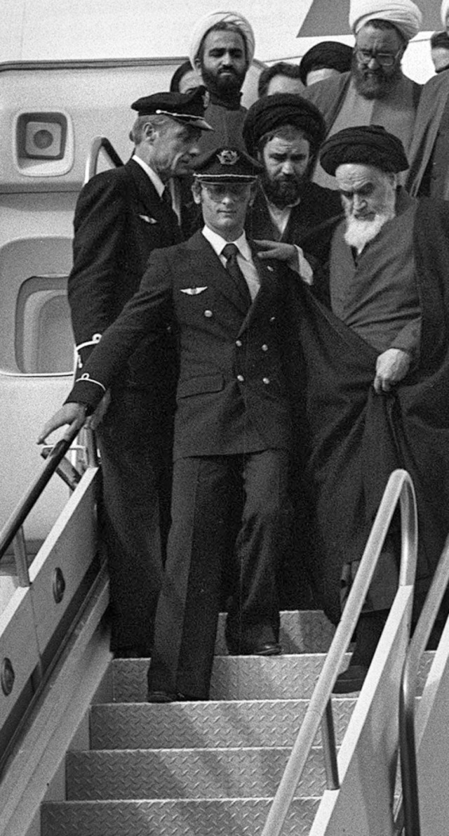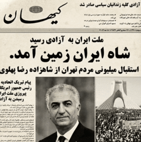 Concernant les événements actuels, un autre fait retient notre attention : l’utilisation pour la première fois de l’Intelligence Artificielle à une grande échelle. On retrouve souvent, mais inversées dans leurs significations, des références à 1979, soulignant la force de certaines images, comme s’il était possible de remplacer le passé par une image concurrente. Ainsi voit-on des jeunes gens, à la mode de 1979, accueillirent avec enthousiasme Reza Pahlavi avec les mots « Vive le roi » ou le journal Keyhan, dans une mise en page en noir et blanc, relater le retour du roi avec un portrait récent du fils du dernier Shah d’Iran, rappelant l’édition du 16 janvier 1979 qui avait annoncé le départ du Shah. Enfin, on peut voir, sur une vidéo, le steward sur lequel s’appuyait l’ayatollah Khomeini pour descendre de l’avion d’Air France, le 1er février 1979, assister Mohammad Reza Pahlavi sur l’escalier de l’avion Shahin que le Shah, décédé le 27 juillet 1980, pilotait lors de son départ.